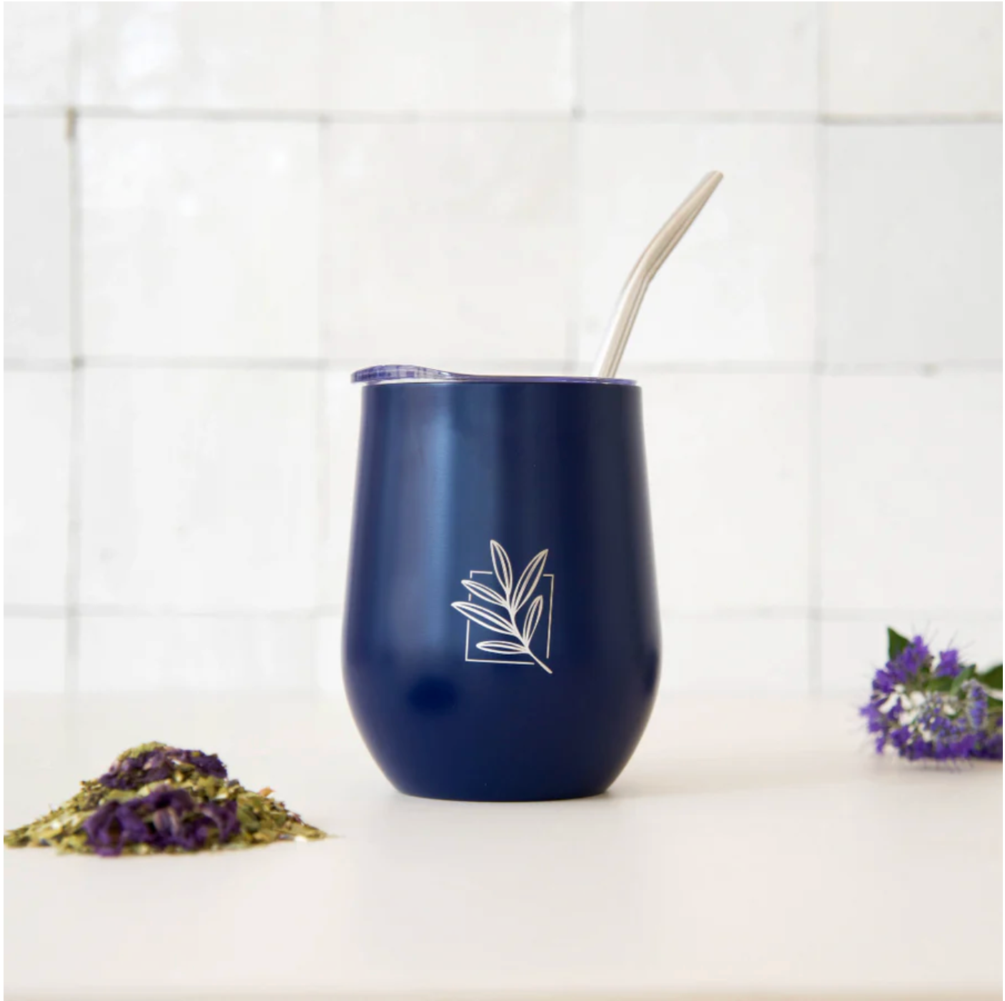 Calebasse isotherme en inox double paroi équipée d’un opercule étanche.